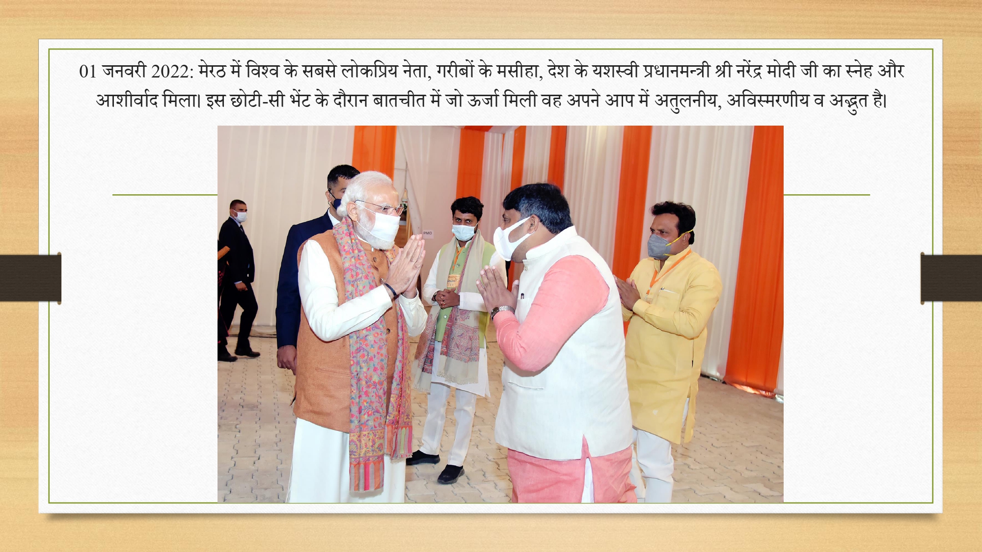 '1 जनवरी 2022 मेरठ में विश्व के सबसे लोकप्रिय नेता गरीबों के मसीहा देश के यशस्वी प्रधानमंत्री श्री नरेंद्र मोदीजी का स्नेह और आशीर्वाद मिला इस छोटी सी भेंट के दौरान बातचीत में जो ऊर्जा मिली वह अपने आप '