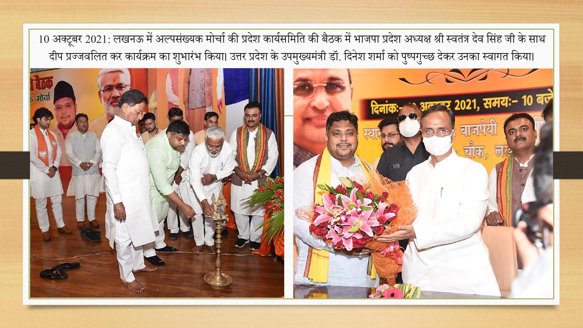 '10 अक्टूबर 2021 लखनऊ में अल्पसंख्यक मोर्चा की प्रदेश कार्यसमिति की बैठक में भाजपा प्रदेश कार्यसमिति की बैठक में भाजपा प्रदेश अध्यक्ष श्री स्वतंत्र देव सिंह जी के साथ दीप प्रज्वलित कर कार्यक्रम का शुभा'