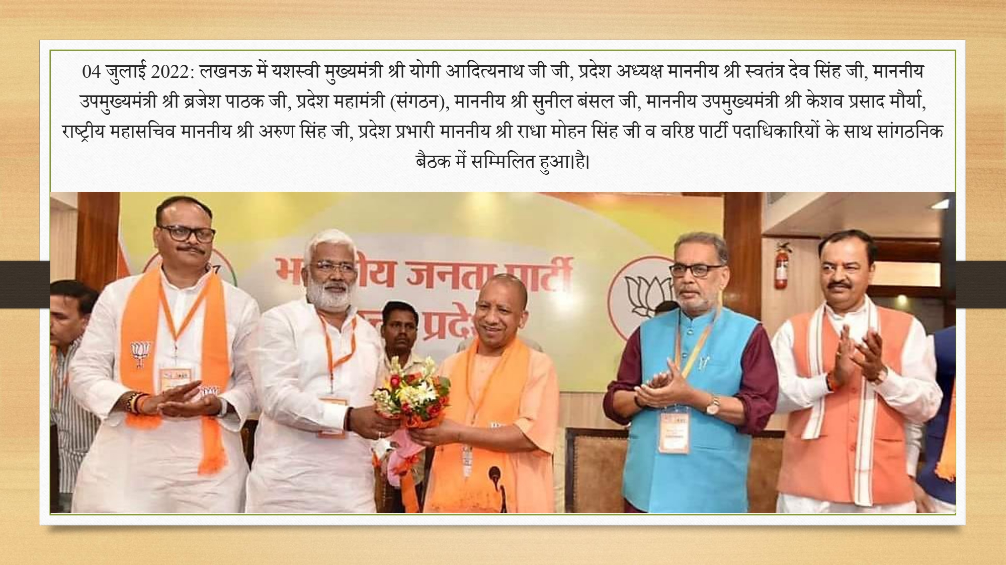 'आज लखनऊ में माननीय मुख्‍यमंत्री पूज्‍य श्री योगी आदित्‍यनाथ जी से स्‍नेहिल मुलाकात की। आगामी कार्य योजनाओं पर चर्चा कर आपका मार्गदर्शन प्राप्‍त किया और उन्‍होंने अपना स्‍नेह प्रकट करते हुए आर्शीवाद प्'