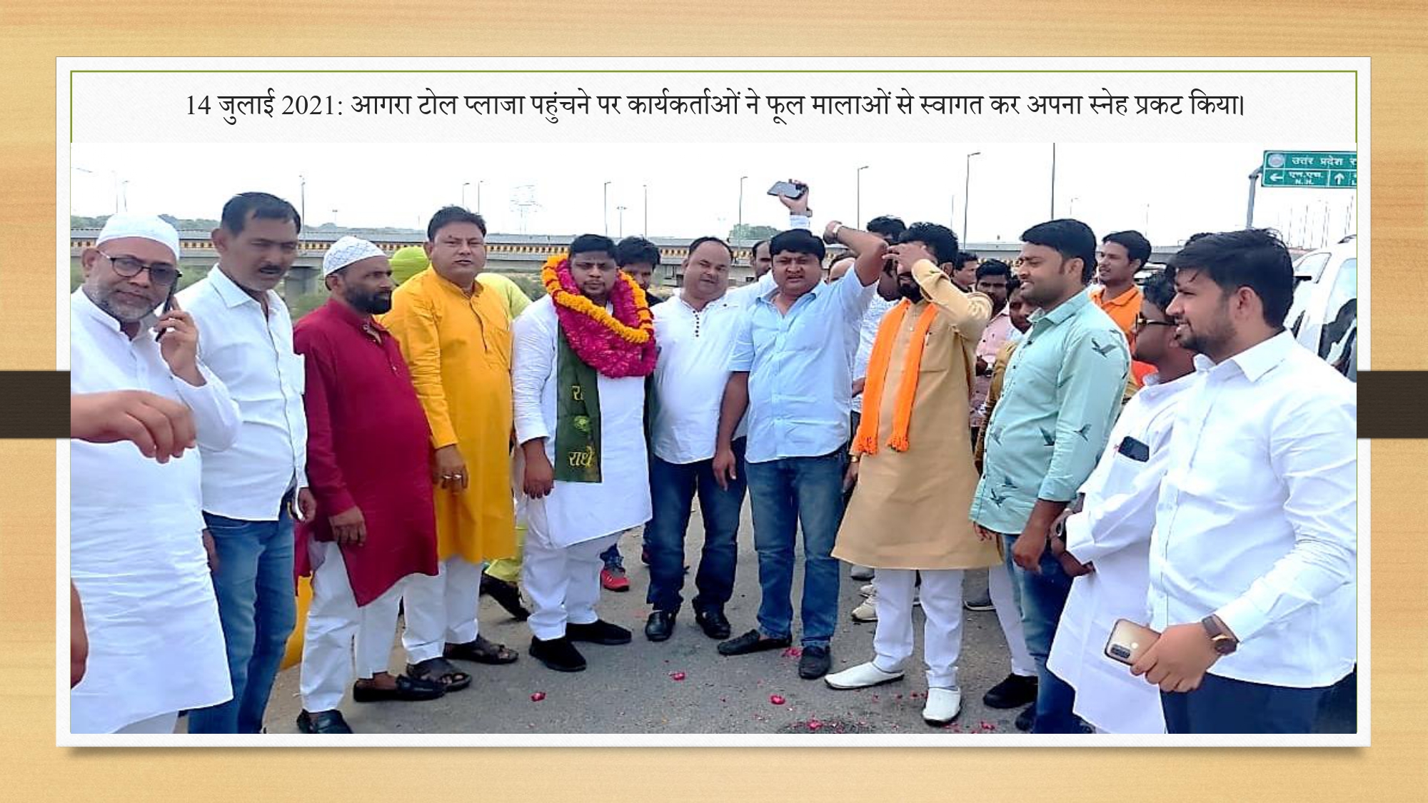 '14 जुलाई 2021 आगरा टोल प्लाजा पहुंचने पर कार्यकर्ताओं ने फूल मालाओं से स्वागत कर अपना इसने प्रकट किया|'