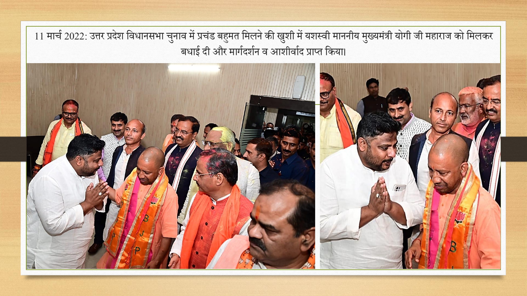 '11 मार्च 2022 उत्तर प्रदेश विधानसभा चुनाव में प्रचंड बहुमत मिलने की खुशी में यशस्वी माननीय मुख्यमंत्री योगी जी महाराज को मिलकर बधाई दी और मार्गदर्शन वह आशीर्वाद प्राप्त किया |'
