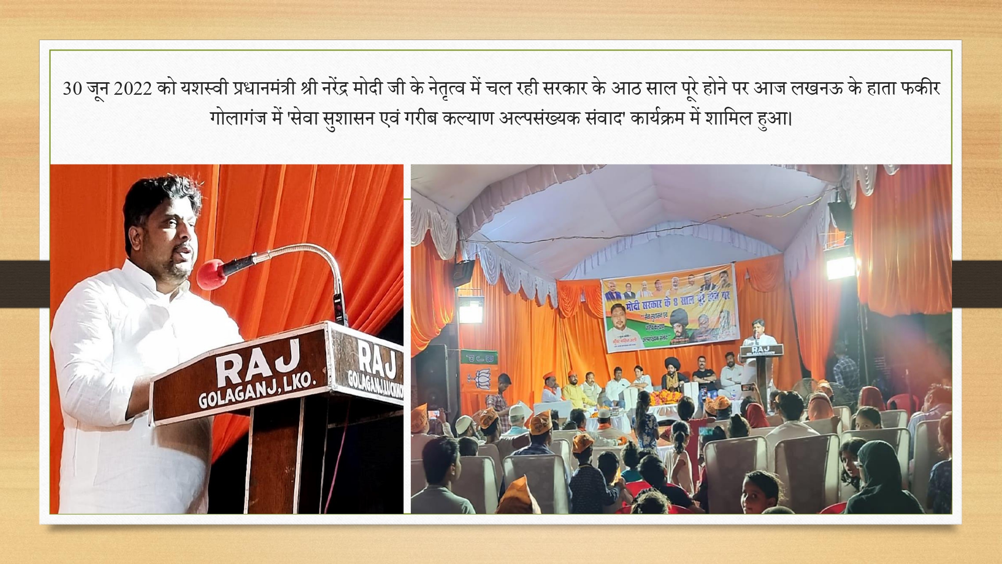 'यशस्वी प्रधानमंत्री श्री नरेंद्र मोदी जी के नेतृत्व में चल रही सरकार के 8 साल पूरे होने पर आज लखनऊ के हाता फकीर गोलागंज में सेवा सुशासन एवं गरीब कल्याण अल्पसंख्यक संवाद कार्यक्रम में शामिल हुए'