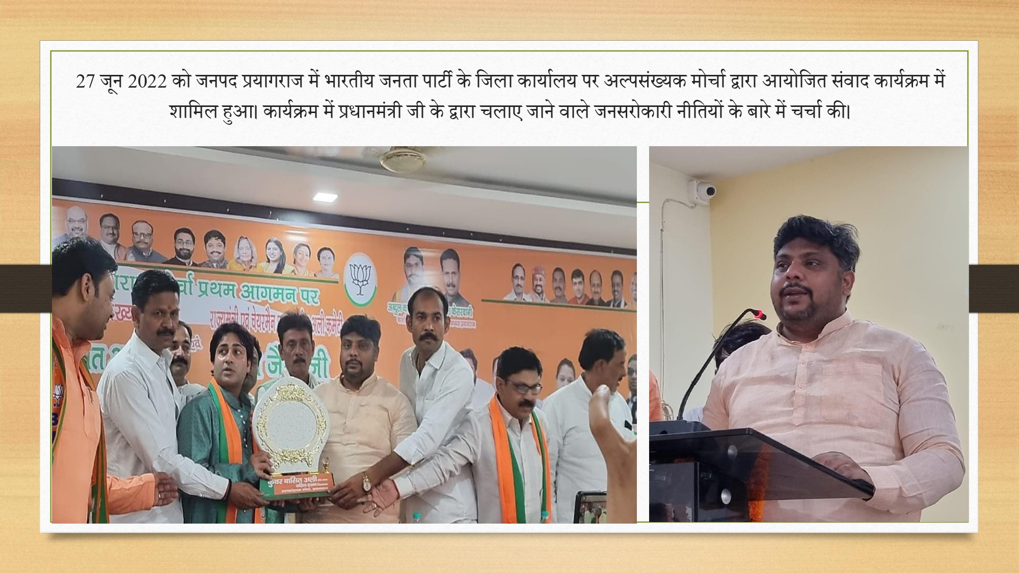 'जनपद प्रयागराज में भारतीय जनता पार्टी के जिला कार्यालय पर अल्पसंख्यक मोर्चा द्वारा आयोजित संवाद कार्यक्रम में शामिल हुए कार्यक्रम में प्रधानमंत्री जी के द्वारा चलाए जाने वाले जनसरोकारी नीतियों के बार'